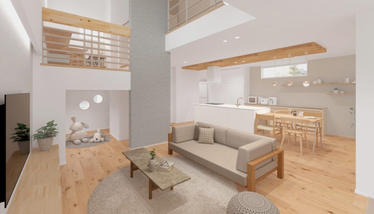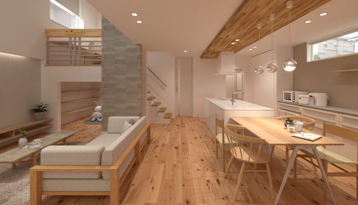 フロアの涵さを半階分ずらし、 各階の間に中二階部分を生み出すスキップフロア。 扉や壁を設けないため開放感があり空間に奥行や広がりをもたらします。 各フロアが緩やかにつながることで、 家族がいつも一つの空間の中にいるような心地よい「つながり」を感じられます。 また、 吹き抜けやスリット階段で上下につながる立体空間により、 視線が抜ける開放的な住まいを実現。 どこにいても家族の気配を感じられる空間設計に。