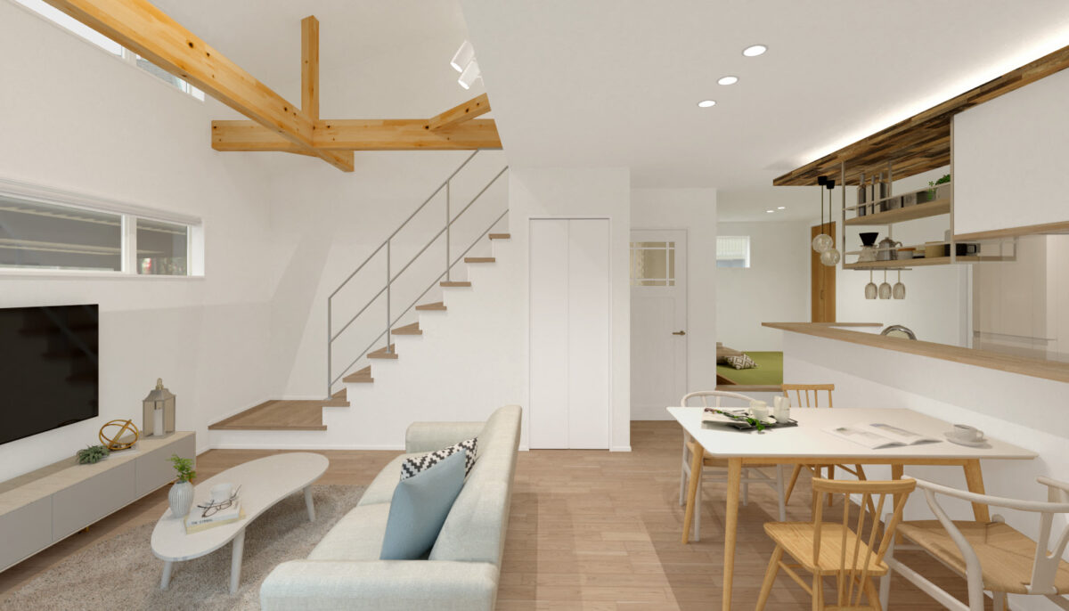 リビングは勾配天井を採用し、空間に広がりと開放感をもたらします。窓からたっぷりと光が差し込み、明るく心地よい居場所に。階段の手すりを鉄骨にすることで、空間にスタイリッシュなアクセントを加えつつ、視線が抜けて開放感を高めます。